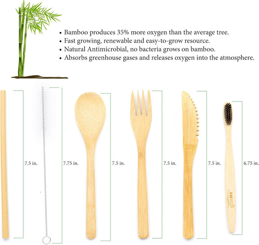 Eco Bamboo Travel Cutlery Set, Spoon, Fork, Knive, Totthbrush, Straw, and Straw Cleaner (Green)